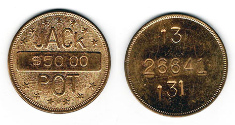 Original, brass. Generic jackpot gold award token. Stamped $50.00. Each has incuse
